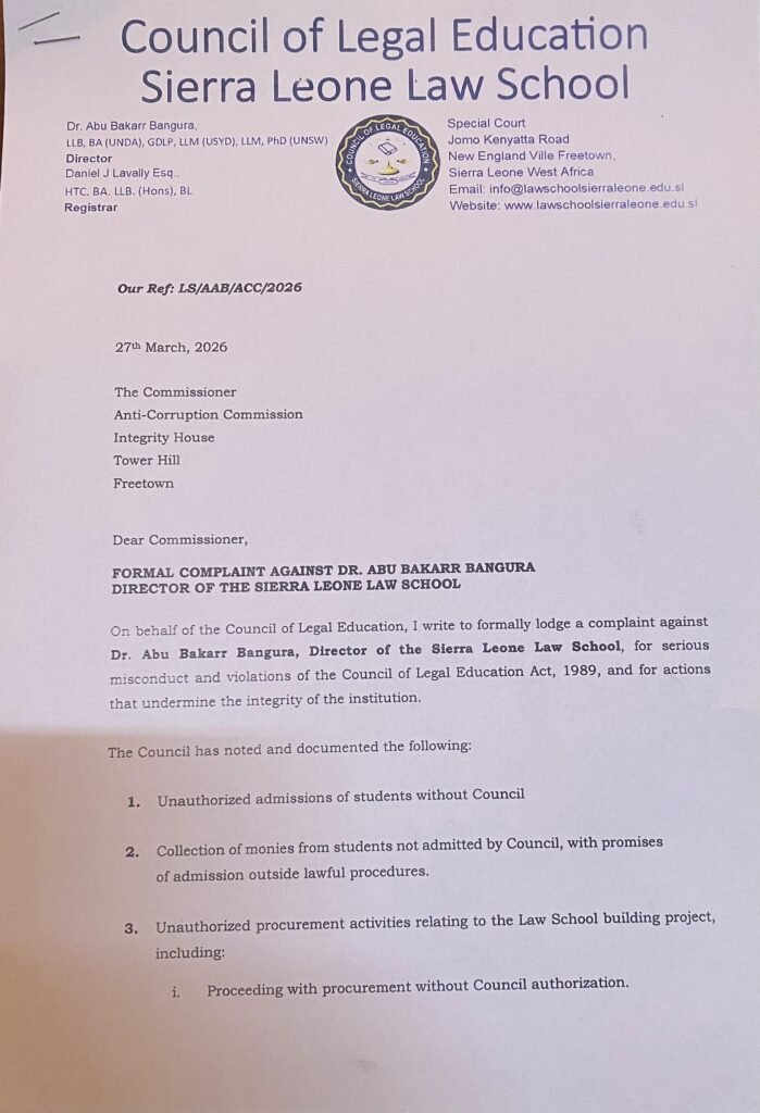 Freetown, Sierra Leone – The Council of Legal Education has lodged a formal complaint with the Anti-Corruption Commission against…