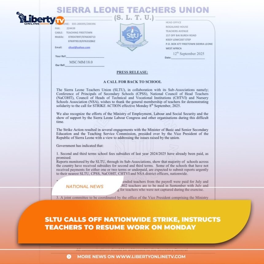 Finally, following an emergency meeting on Friday, September 12th, 2025, the SLTU and its groups have called off the strike action with immediate effect.