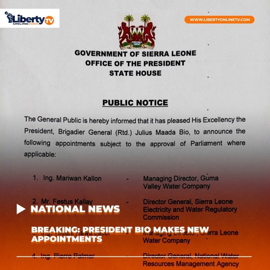 The President, His Excellency Julius Maada Bio has announced major new appointments in Sierra Leone’s water and energy sectors, aimed at strengthening governance and service delivery.