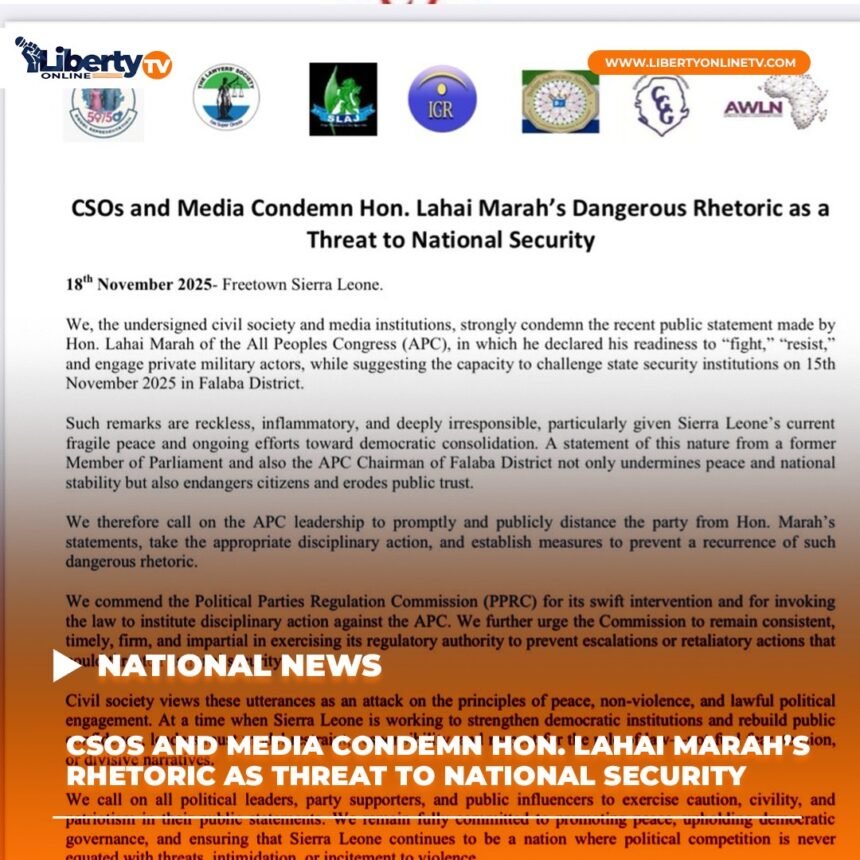 A coalition of leading civil society and media institutions has issued a strong rebuke against Hon. Lahai Marah of the All Peoples Congress (APC) after he publicly declared that he was ready to “fight,” “resist,” and even engage private military actors—comments made during a gathering in Falaba District on 15 November.