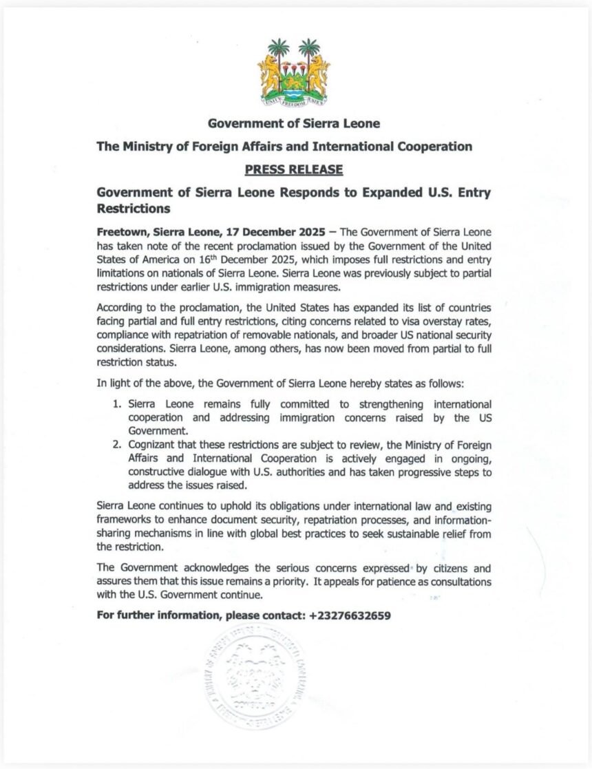 Freetown, 17 December 2025 – The Government of Sierra Leone has announced that it has commenced consultations with the United States following the recent full entry ban on Sierra Leonean nationals. The move comes after a proclamation signed by U.S. President Donald J. Trump on 16 December 2025, expanding America’s travel ban to countries the White House says pose national security and immigration enforcement risks.