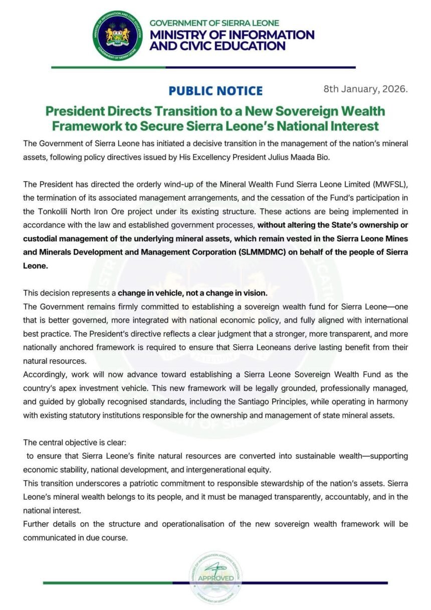 President Julius Maada Bio has directed a major restructuring of how Sierra Leone manages its mineral wealth, ordering the wind-up of the Mineral Wealth Fund Sierra Leone Limited (MWFSL) and its withdrawal from the Tonkolili North Iron Ore project under the current arrangement.