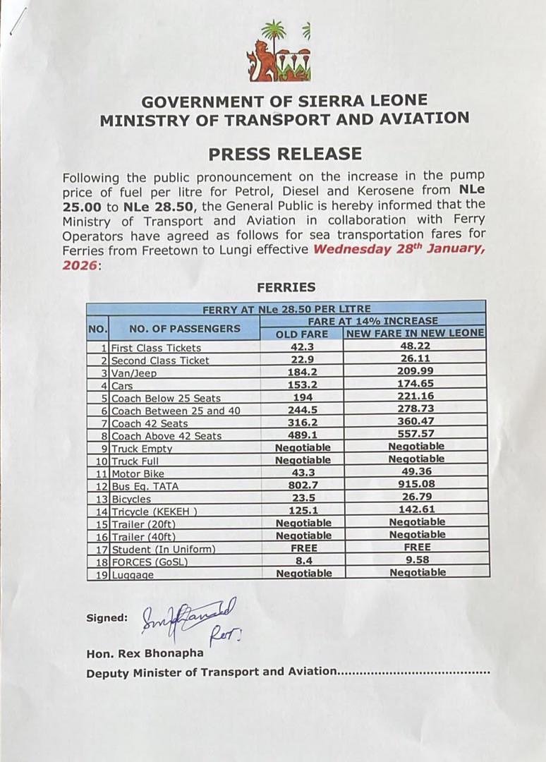 The Ministry stated that the fare adjustments were agreed upon in collaboration with ferry operators to reflect the rising cost of fuel while maintaining continued sea transport services between Freetown and Lungi.