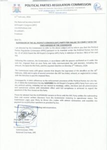 Consequently, the PPRC announced the immediate suspension of the party from carrying out any political activities, including meetings, rallies, elections, and administrative or operational functions.