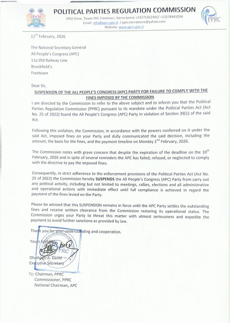 The Political Parties Regulation Commission (PPRC) has suspended the All People’s Congress (APC) from all political activities with immediate effect for failing to comply with fines imposed by the Commission.