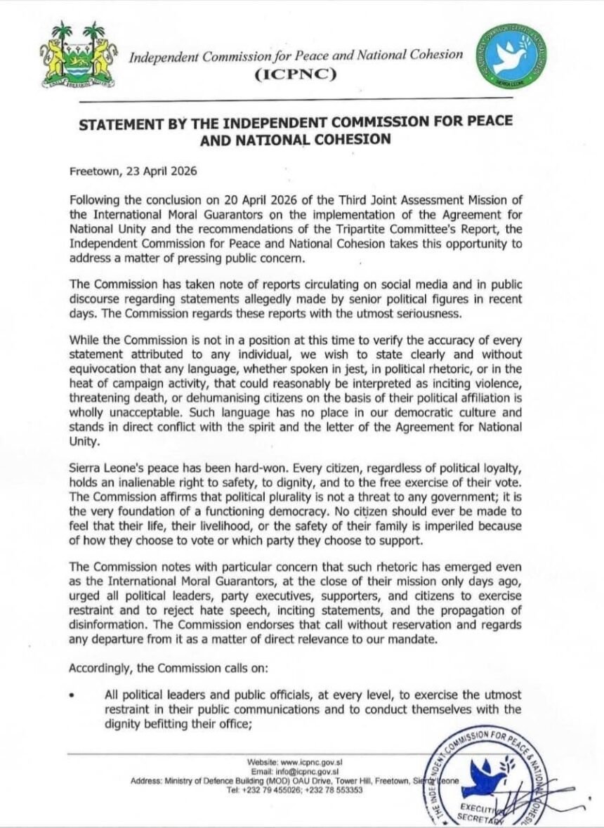 FREETOWN – Sierra Leone’s Independent Commission for Peace and National Cohesion has issued a stern warning to political leaders and public officials over recent statements allegedly made by senior political figures, saying any language that could incite violence or threaten citizens based on their political affiliation is “wholly unacceptable.”